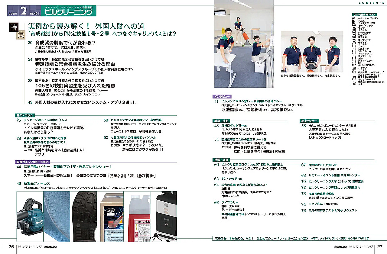 2026年2月号は、大きな転換点を迎える外国人雇用を特集します。📢 2027年4月施行の育成就労制度では、技能実習制度から一転して転籍が容認されます。🔄 これからのビルメンテナンス企業に求められるのは、人材の囲い込みではなく、働き手から選ばれ続けるための環境整備です。🏢✨ 本号では、杉田昌平弁護士が新制度を徹底解説。⚖️ さらに合格率10%の難関、特定技能2号の合格者を輩出した企業の先進事例も紹介します。🏆 外国人材を労働力ではなく次世代リーダーへと引き上げる経営戦略を凝縮した、経営者・管理者必読の一冊です。📕🤝