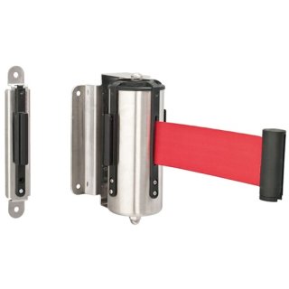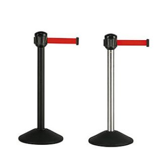 施設の誘導・規制をワイドにサポートする5.5mロングベルトタイプです。設置や収納時にベルトが手から離れてもゆっくり巻き戻り、ベルト暴れを防止します。