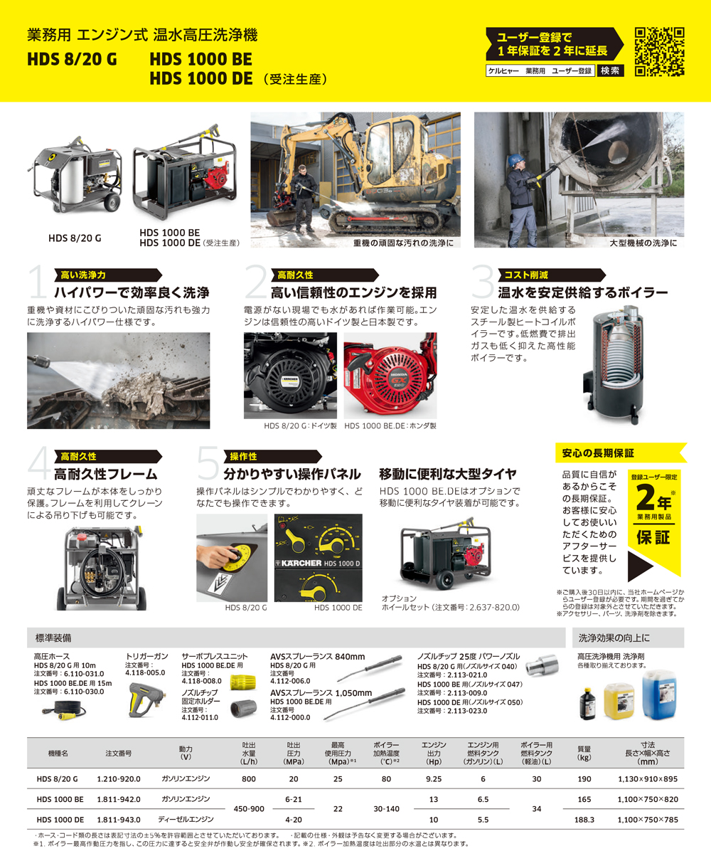 ◎高い耐久性 品質に自信があるからこその長期保証です。 ◎耐久性 ・高耐久性フレーム 頑丈なフレームが本体をしっかり保護します。 フレームを利用してクレーンでの吊り下げも可能です。 ・信頼性の高いエンジン エンジンは信頼性の高いドイツ製(HDS 8/20 G)と日本製(HDS 1000 BE/DE)を採用しています。 ◎ケルヒャーだけの保証制度 業務用製品は、ユーザー登録で保証期間が1年から2年に延長されます。 ご購入後30日以内に、当社ホームページからのユーザー登録が必要です。 ※アクセサリー、パーツ、洗浄剤は除きます。 |