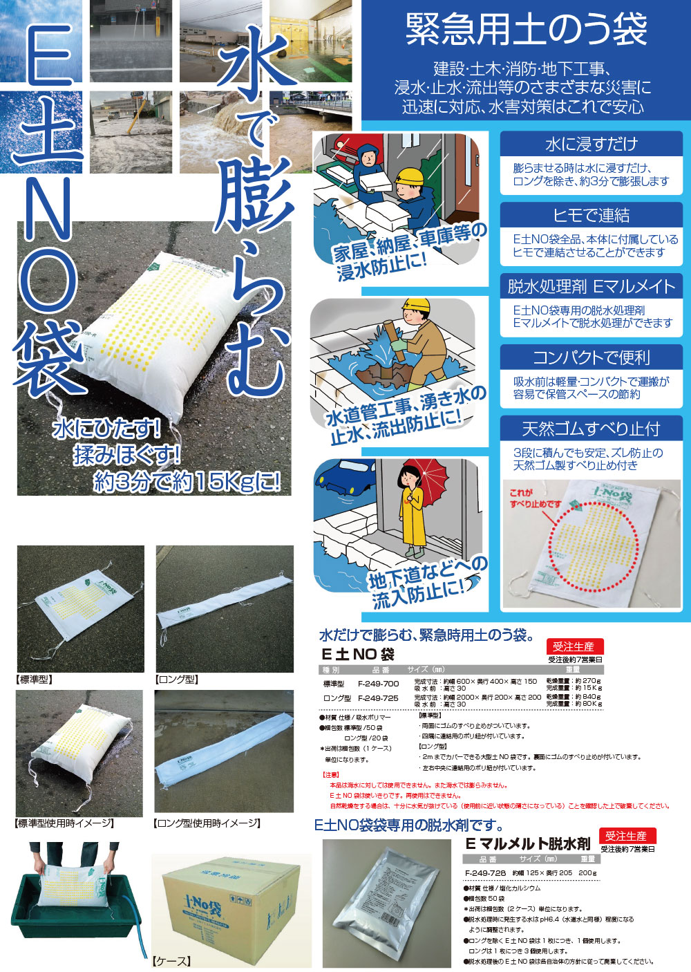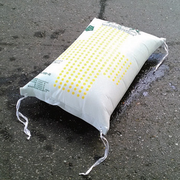 水だけで膨らむ、緊急時用土のう袋です。家屋や車庫などの浸水防止、水道管工事や湧き水の止水、地下道への流入防止など、様々な水害対策に役立ちます。水に浸すだけで約3分で膨らむので、緊急時でもスピーディに対応できます。吸水前は軽量でコンパクトなので、運搬や保管スペースの節約にもなります。