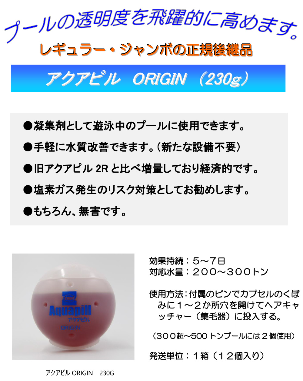 蔵王産業 アクアピル ORIGIN [230g×12個] - 有機系大型プール用凝集剤【代引不可・個人宅配送不可・直送1500円】