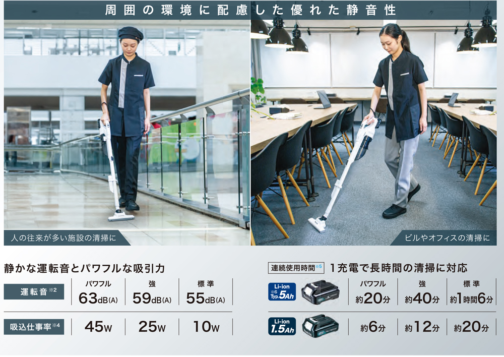 - 優れた静音性: 標準モード55dB(A)、パワフルモードでも63dB(A)の低騒音。人の往来が多い施設やオフィス清掃に最適です。