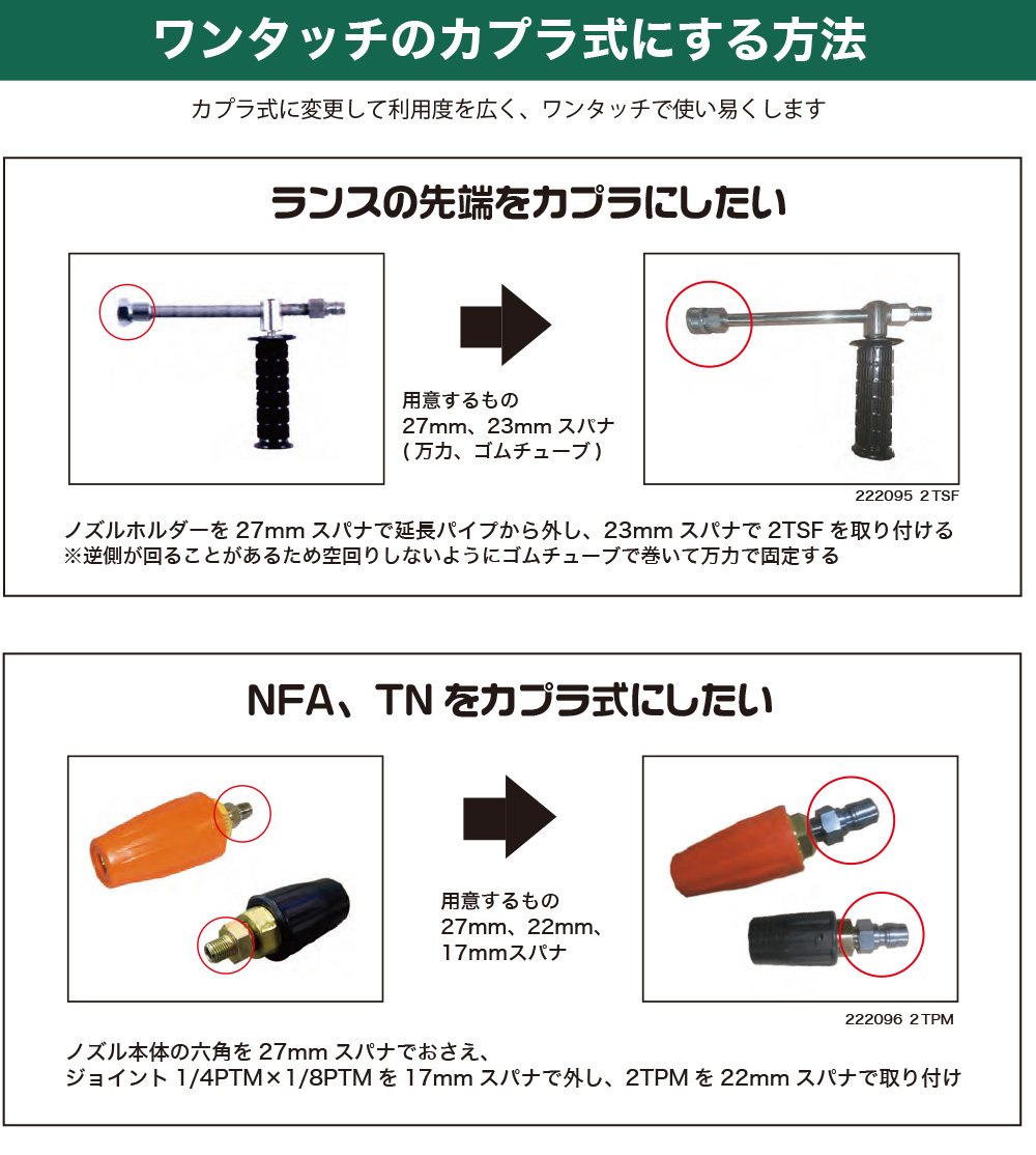 - 圧力と水量に合ったノズルを選ぶことで、洗浄機の能力をフルに発揮させます。