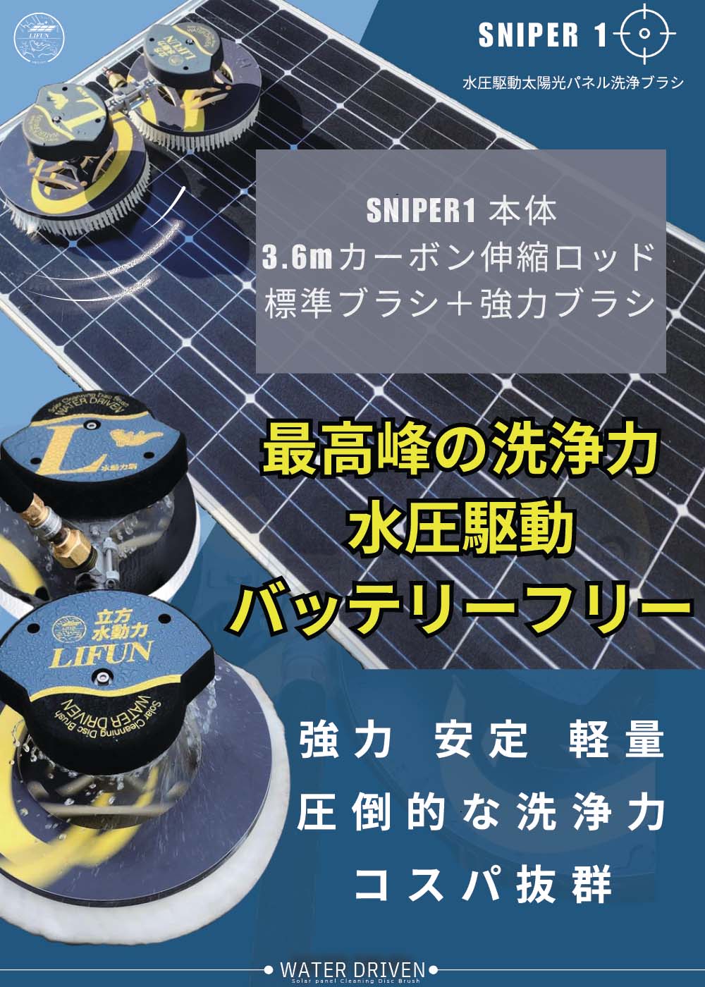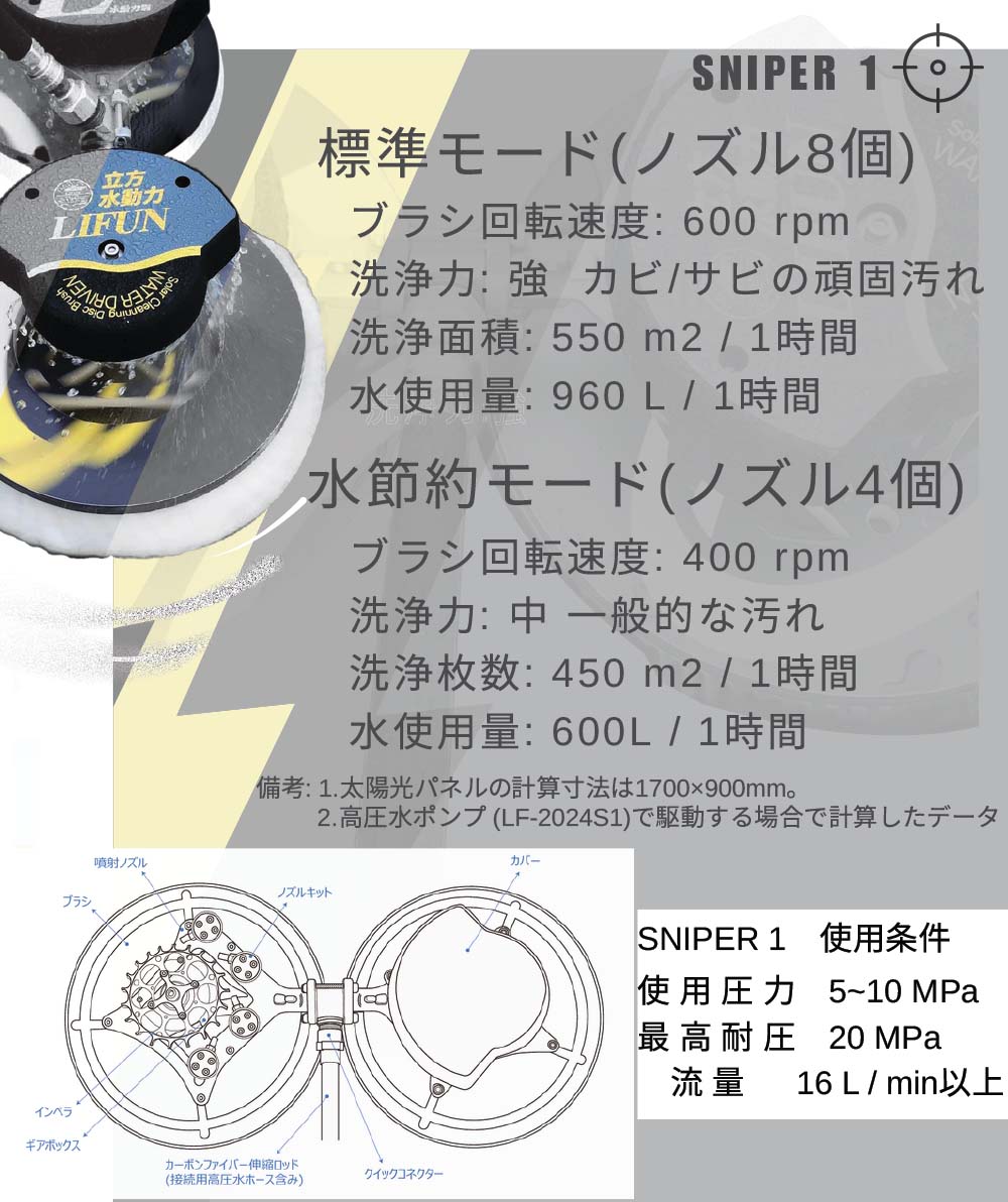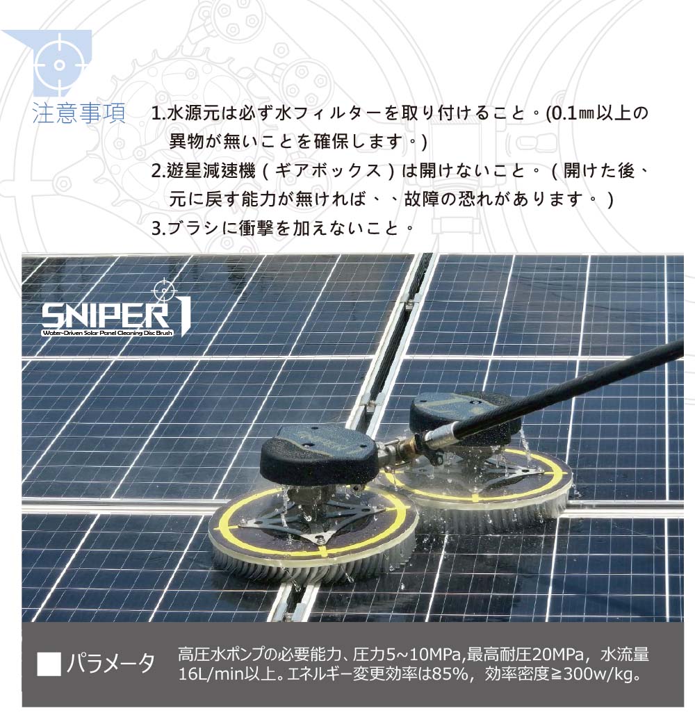 水圧だけで「適切な回転」を生み出す。25年使ってもパネルを傷つけない安全性。SNIPER1の2つの圧倒的強み