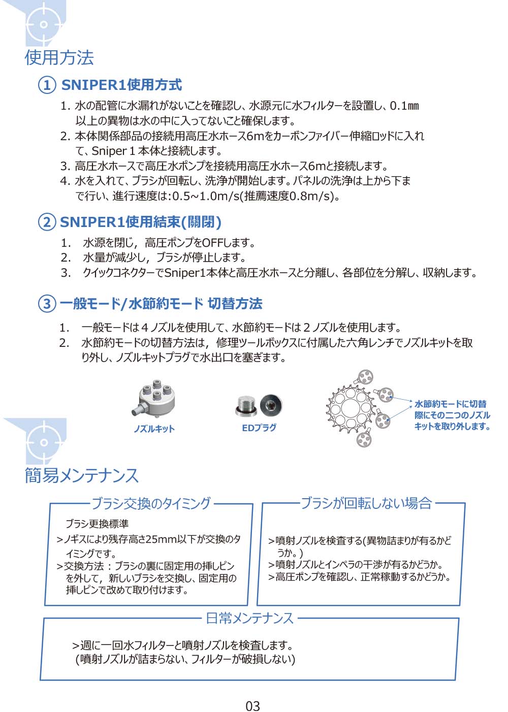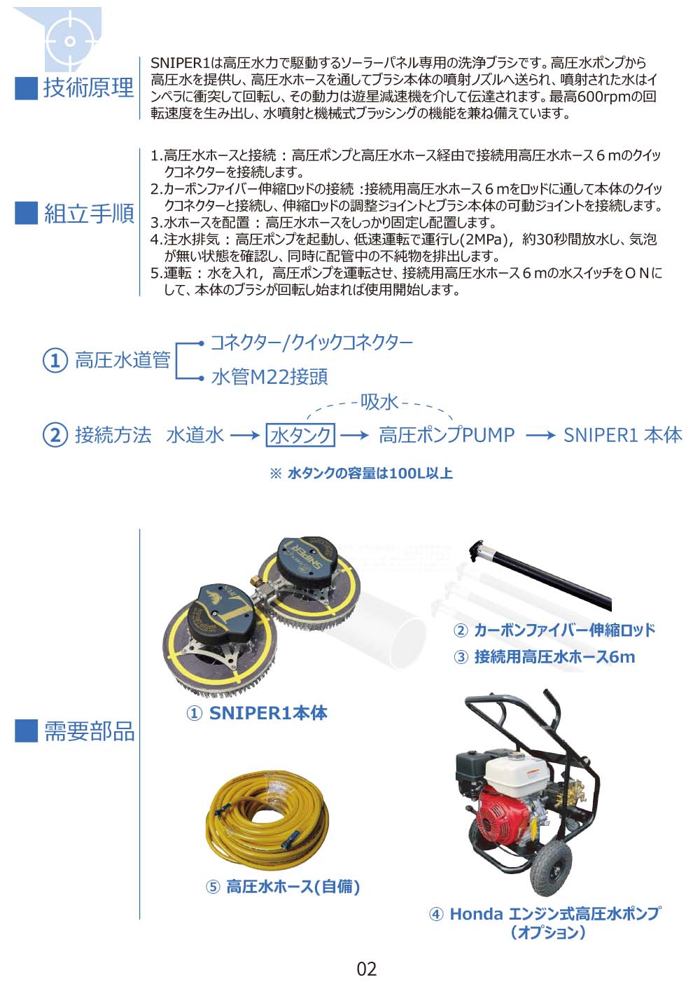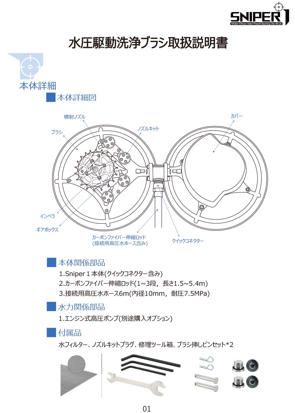 | 標準装備(付属品) | Sniper1本体(クイックコネクター含み)、カーボンファイバー伸縮ロッド(1〜3段、長さ1.5〜5.4m)、接続用高圧水ホース6m、水フィルター、ノズルキットプラグ、修理ツール箱、ブラシ挿しピンセット×2、標準ブラシ2個 、強力ブラシ2個 |