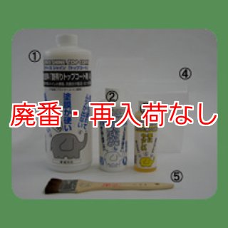 (1)水性塗料「艶有りトップコートA」100cc、(2)下地剤「プライマーコート」100cc、(3)ハクリ剤「ストリッパー」100cc、(4)刷毛