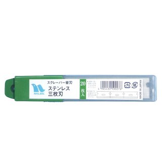 標準でナルビー社製の3枚刃を装着済み。3枚刃は腰が強くしなりにくくて、刃先は非常に鋭利なのが特徴です。そのため削る力が強く、固着した頑固な汚れも力強く削り取れます。プロの清掃業者にも愛用される3枚刃タイプで、窓ガラスのこびりついた汚れからタイル、IHクッキングヒーターなどの硬く平らな面に付着した油汚れ、水垢、塗料、接着剤、シール、霜等の除去まで幅広く活躍します。また替刃式なので、切れ味が落ちても替刃を交換するだけで常にベストな切れ味を維持でき、長期間ご使用いただけます。