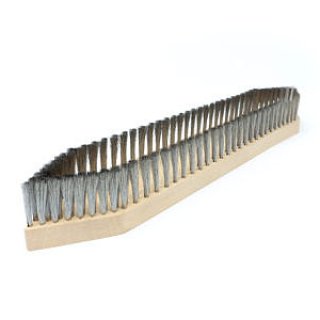 短時間で素早く塗り広げる役割でフローリングを剥離しなければならない異例のケースに対応したものです。新しいコーティングを施す際の下地作りとしても重点を置いています。ウレタンや二液性のコーティング、UVほかファインコートなど硬膜を施す際にしっかり除去しなければなりません。ゴシゴシ擦りつけず車のワイパーのような動きを取り入れながら全体を均一に撹拌します。撹拌剥離はドライバック推奨ですが、フローリングの場合はさせないのが原則です。溶解反応と同時に撹拌しながら相乗効果によりひたすらブラシを動かします。この時引っかかる感覚が手に伝わり溶解される階層が増えるほど重くなりますので水を足して撹拌し、なるべくゲル化する前にバキュームします。多少ゲルが毛材にまとわりつきますが、目詰まりによる撹拌の低下は発生しません。簡単に水で洗い流せます。薄皮を回数で分けて溶かしていくような作業のイメージになります。このブラシは「ぬり」のブラシより剛性の強い0.2を使用し植毛ピッチが大きくとってあります。配列の特徴は手首への負担を軽減するセンターレス構造になっています。