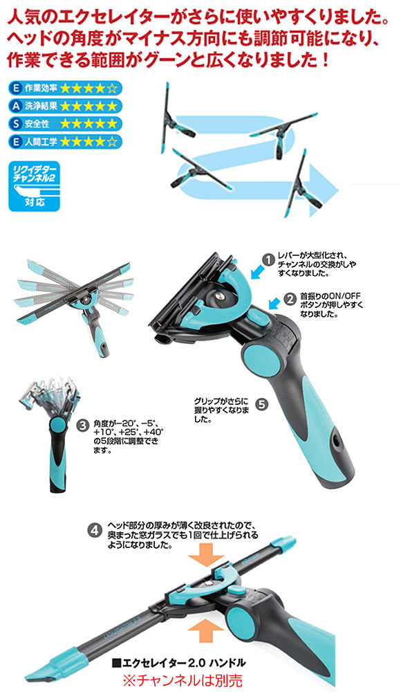 ヘッドの角度がマイナス方向にも調節可能になり作業できる範囲がグーンと広くなりました! クネクネと自由自在に首振りするヘッドが、手首の動きをしなやかにガラスに伝え短時間でキレイに仕上げます。