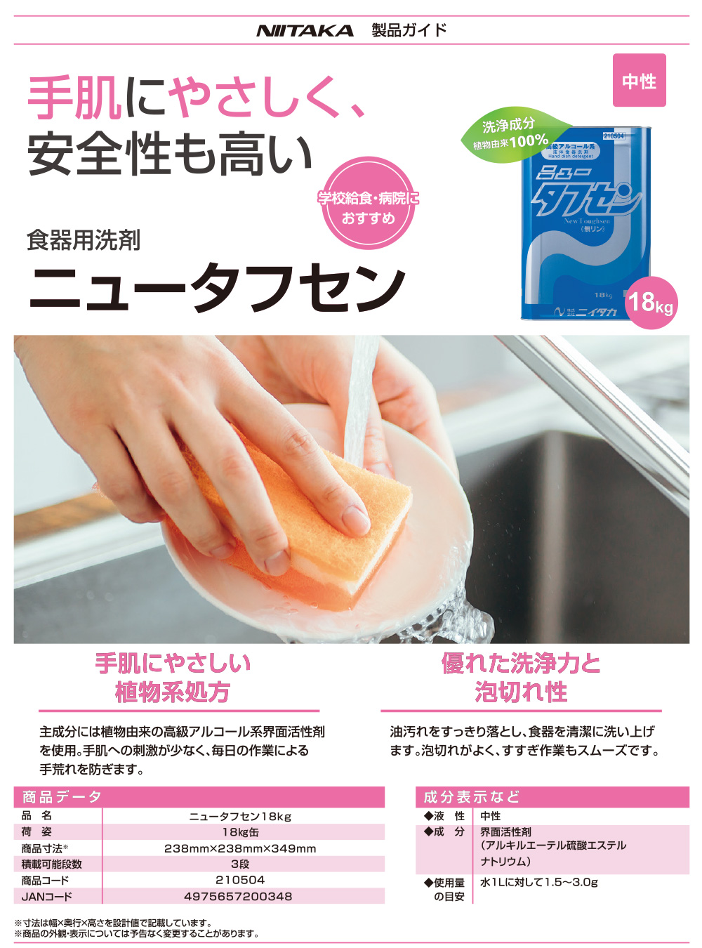 ■送料無料・5缶以上での注文はこちら■ニイタカ ニュータフセン 18kg - 病院・学校給食向け 高級アルコール系洗剤 【代引不可・個人宅配送不可】