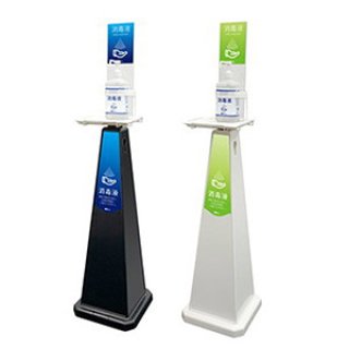 安心・安全を確保するための消毒液の設置は「常識」に。色鮮やかなデザインでアピールする樹脂製消毒スタンドです。